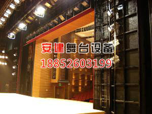 活动假台口采用型材制作,其两侧片(假台口)采用悬挂式(即侧片通过滚轮悬挂在前天桥下的轨道上,侧片可延轨道在台口方向运动,达到改变台口尺寸目的),其优点在于对舞台台面影响小,观察角大. 渡桥提升采用曳引式驱动,安全保护性好,在电器失控的状态下能对设备起一定的保护。